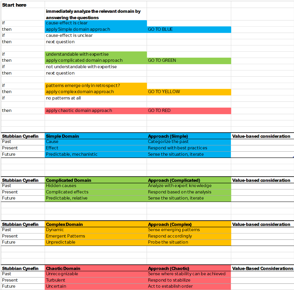 Mielessäni siis syntyi ajatus Stubbilaisesta Cynefin-työkalusta. Pyörittelin ajatusta lukuisten generatiivisten tekoälyjen kanssa ristiin ja rastiin ja loppujen lopuksi tein excelin, koska niin maailma makaa. Exceleiden varassa.